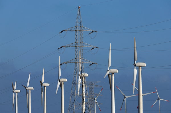 High-voltage power lines and an electricity pylon next to a group of wind turbines, in Barranco de Tirajana, in the island of Gran Canaria, Spain, on May 11, 2022.BORJA SUAREZ/Reuters