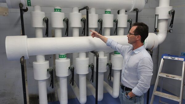The company's facilities manager Craig Lee points to cooling loop of the geothermal system.Wallace Immen/The Globe and Mail