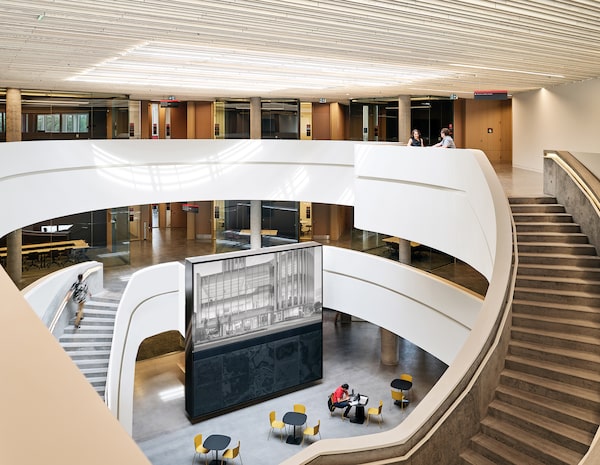 The buildings of many well-known schools lacked flexibility and visual interest, Mr. Hariri says. The curving walls of the six-storey Nicol Building also allow every classroom and every office to have views of the surrounding landscape and campus.