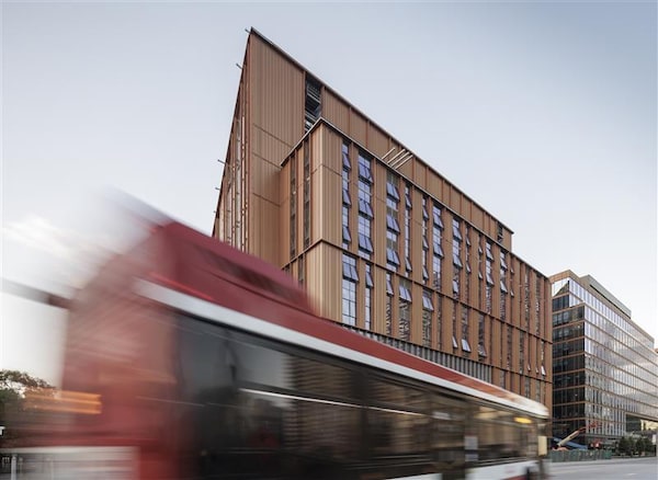 Limberlost Place, a striking mass-timber building at Queens Quay East and Dockside Drive, is the new addition to George Brown College’s waterfront campus.Salina Kassam Photography