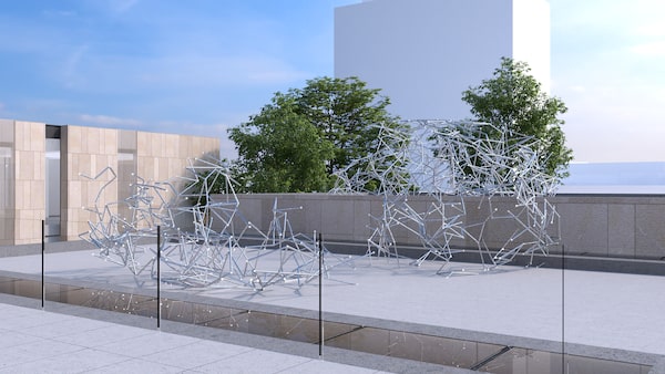 Atop the terrace sits a polished stainless steel sculpture, dubbed Candelabra, by Montreal-based artist Nicolas Baier, who created a new constellation network based on astronomical data from Montreal’s sky.