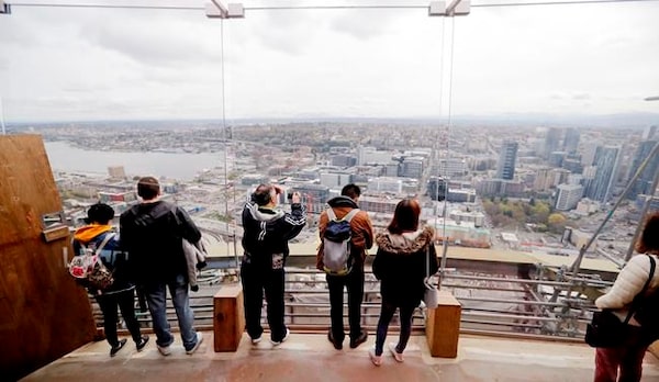 Space Needle visitors look east through newly-installed glass panels to Seattle below. The landmark has undergone its biggest renovation in its 56-year history, a US$100-million that transformed the structure's top viewing level.Elaine Thompson/The Canadian Press