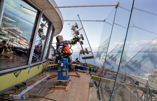 A 900-kilogram glass panel is moved into position on the Space Needle's observation deck in Seattle. The landmark has new floor-to-ceiling glass in the observation deck and its restaurant has been remodelled in the first phase of the renovation.Elaine Thompson/The Associated Press