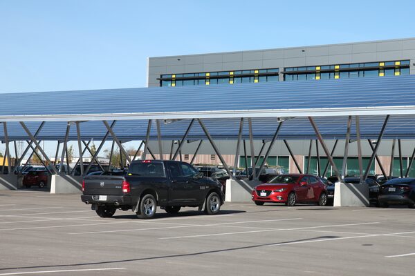 Some of the building’s sustainable features are obvious, such as solar panels on the roof and over sections of the parking lot, which also has 28 electric vehicle charging stations. The building is expected to produce 50,000 kilowatt hours a year of surplus energy for the local grid.
