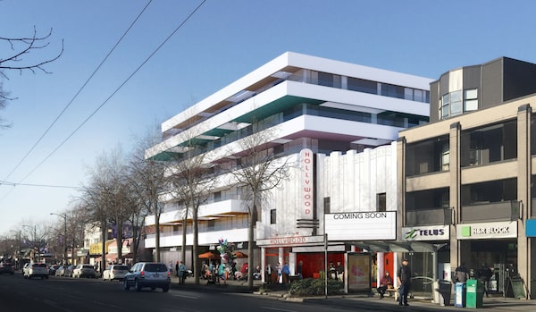 Vancouver's Hollywood Theatre is being restored – including its neon signage and clock – as part of a mixed-use development.4184 Investments Ltd.