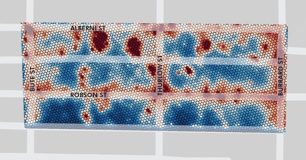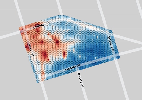 She created a heat map comparing foot traffic in the downtowns of three of Canada’s largest cities before and after the lockdown. A stark picture emerged from her analysis of the data, using third-party mobile-device tracking data from Yonge-Dundas Square in Toronto, Robson Street in Vancouver and Sainte-Catherine Street in Montreal between January 1 and May 31, 2020.