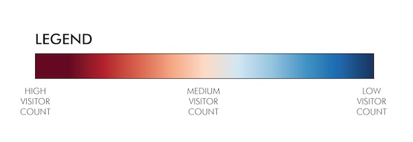 Compared with 2019 patterns, the red in the heat maps rapidly cooled to blue. Foot traffic in Vancouver decreased by 74 per cent, by 84 per cent in Toronto and by 88 per cent in Montreal.