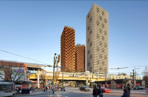 A Safeway redevelopment at the Commercial-Broadway SkyTrain transit station in Vancouver features three towers and an expanded Safeway supermarket that anchors a new retail plaza.Supplied/Perkins&Will, Westbank and Crombie REIT