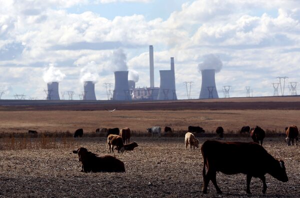 Cows graze as steam rises from the cooling towers of the Matla Power Station, a coal-fired power plant operated by Eskom in Mpumalanga province, South Africa, on May 20, 2018.Siphiwe Sibeko/Reuters
