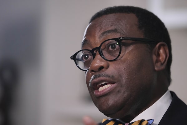 Akinwumi Adesina, president of the African Development Bank, speaks during an interview with The Associated Press, in Lagos, Nigeria, on March 5.Sunday Alamba/The Associated Press