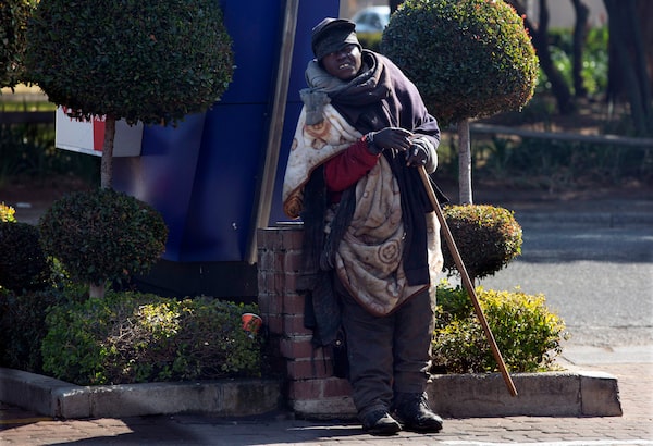 A homeless man stands at a street corner in Johannesburg on July 22, 2020. Official statistics show that South Africa's economy has sunk deeper into recession, with its gross domestic product for the second quarter of 2020 plummeting by 51 per cent, largely as a result of COVID-19 and the country's strict lockdown.Denis Farrell/The Associated Press