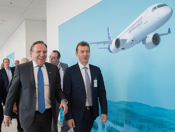 Quebec Premier Francois Legault, left, and Airbus CEO Guillaume Faury take a tour of the Airbus A220 assembly line in Mirabel, Que., on Feb. 20, 2020.Graham Hughes/The Canadian Press
