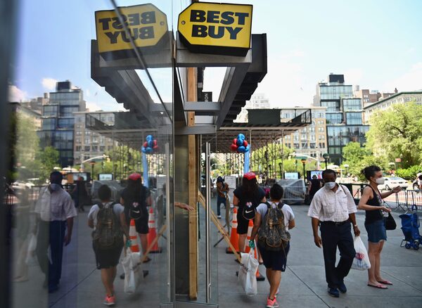 People wearing facemasks walk past a Best Buy store near Union Square on June 25, 2020 in New York City.ANGELA WEISS/AFP/Getty Images