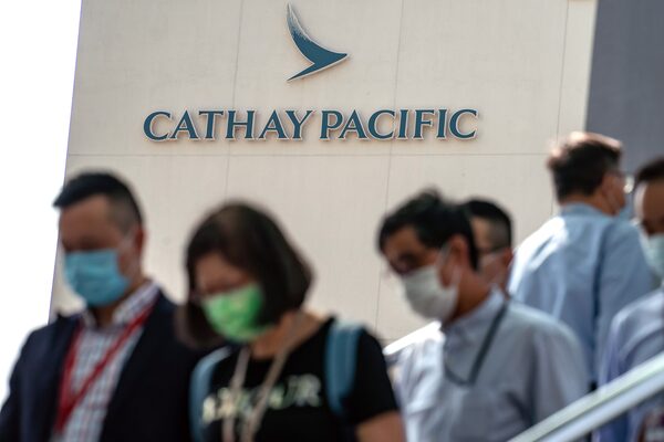 People walk in front of a signage outside Cathay Pacific City building, the headquarters of Cathay Pacific Airways, on Oct. 21, 2020 in Hong Kong, China.Anthony Kwan/Getty Images