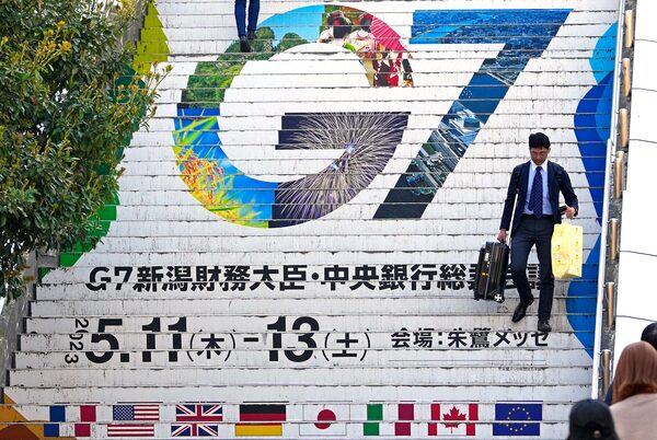 People walk down station stairs featuring the logo of the G7 Finance Ministers and Central Bank Governors meeting, in Niigata, Japan, on May 10.Shuji Kajiyama/The Associated Press