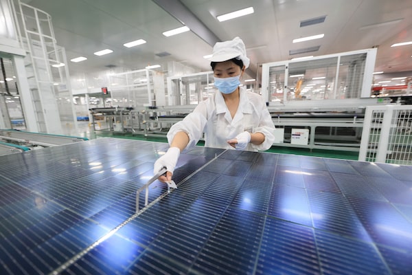 An employee works on photovoltaic cell modules, used in solar panels, in Lianyungang, China in September, 2025.-/AFP/Getty Images
