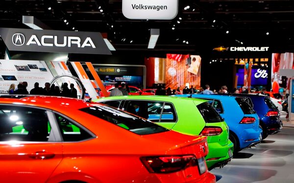 FILE - In a Jan. 15, 2019 file photo, signage for automakers Volkswagen, Acura, Chevrolet and Ford, at the North American International Auto Show in Detroit.The Associated Press