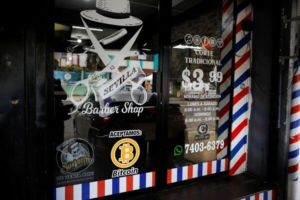 A bitcoin logo on the window of the Sevilla Barber Shop, in Santa Tecla, El Salvador, on Sept. 6.JOSE CABEZAS/Reuters