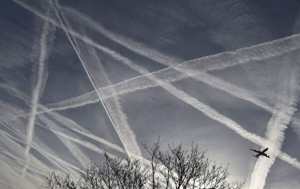 A passenger plane flies through aircraft contrails in the skies near Heathrow Airport in London on April 12, 2015.Toby Melville/Reuters