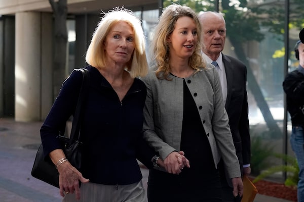 FILE - Former Theranos CEO Elizabeth Holmes, center, her mother, Noel Holmes, left, and father, Christian Holmes IV, arrive at federal court in San Jose, Calif., Thursday, Sept. 1, 2022. Elizabeth Holmes on Tuesday, Sept. 6, 2022, requested a new trial in documents asserting that a key witness who testified against her now regrets the role he played in her criminal conviction for lying to investors about the flaws in a blood-testing technology that she had hailed as a medical breakthrough. (AP Photo/Jeff Chiu, File)Jeff Chiu/The Associated Press