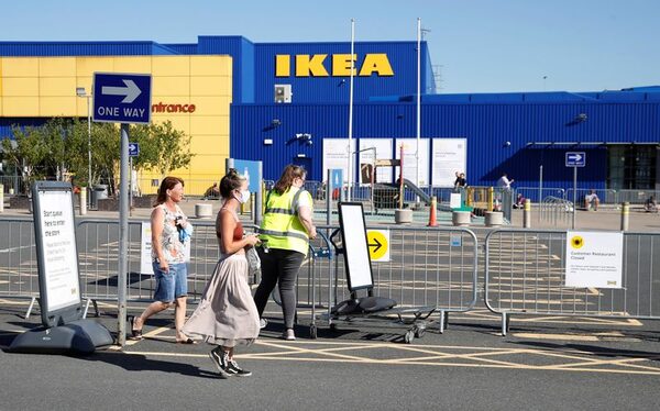 People walk towards IKEA in Warrington as it re-opens, following the outbreak of COVID-19, Warrington, Britain, June 1, 2020.PHIL NOBLE/Reuters