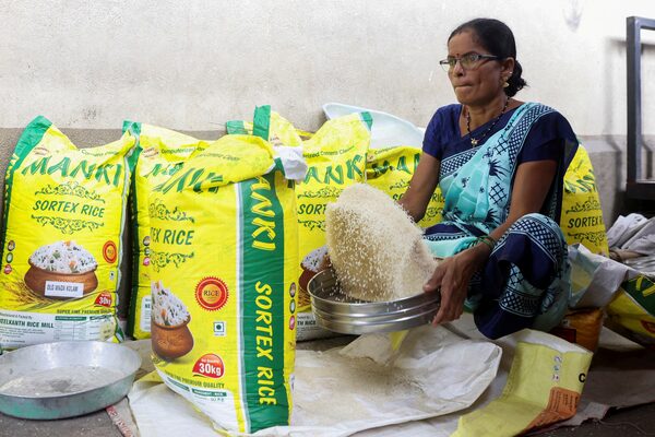A woman cleans rice grains at a wholesale market in Navi Mumbai, India, on Aug. 4, 2023.Francis Mascarenhas/Reuters