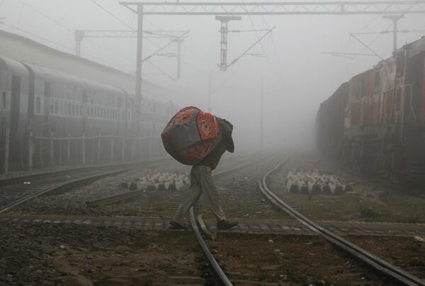 A man carries blankets as he crosses railway tracks on a foggy and cold winter morning in the northern Indian city of Allahabad, on Dec. 29, 2014.Jitendra Prakash/Reuters