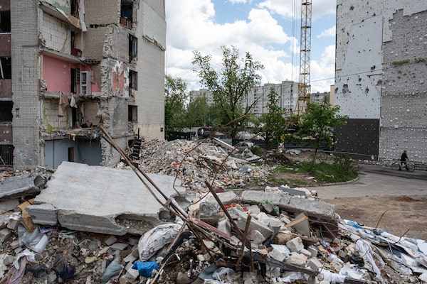 Piles of rubble lie next to a heavily damaged apartment building in Chernihiv, Ukraine, on May 28, 2022.Alexey Furman/Getty Images
