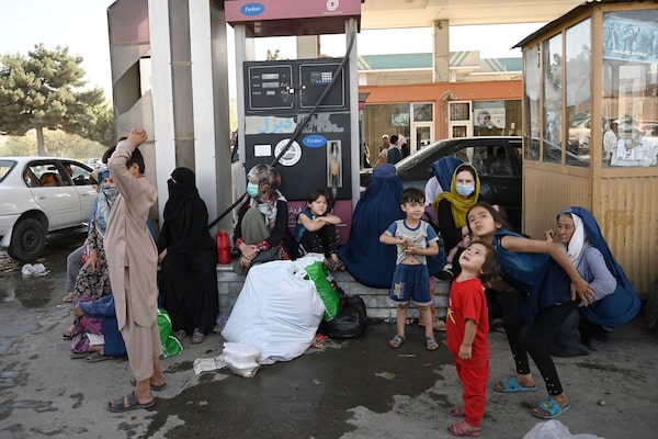 Internally displaced Afghan families, who fled from Kunduz, Takhar and Baghlan province due to battles between Taliban and Afghan security forces, sit at a gas station at Sara-e-Shamali in Kabul on Aug. 11, 2021. The price of gasoline in Afghanistan reached $900 per tonne as many Afghans drove out of cities.WAKIL KOHSAR/AFP/Getty Images