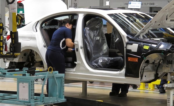 Employees work on the body of a BMW 3 Series car in San Luis Potosi, Mexico, in 2019. Mexico’s automotive and steel industries are highly dependent on the U.S.JOSUE GONZALEZ/Reuters