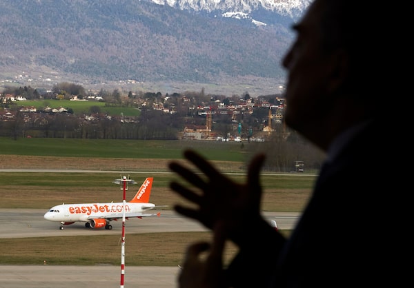 Alexandre de Juniac, head of the International Air Transport Association, is silhouetted in front of an EasyJet aircraft at Cointrin airport in Geneva, Switzerland, on March 13, 2020.DENIS BALIBOUSE/Reuters