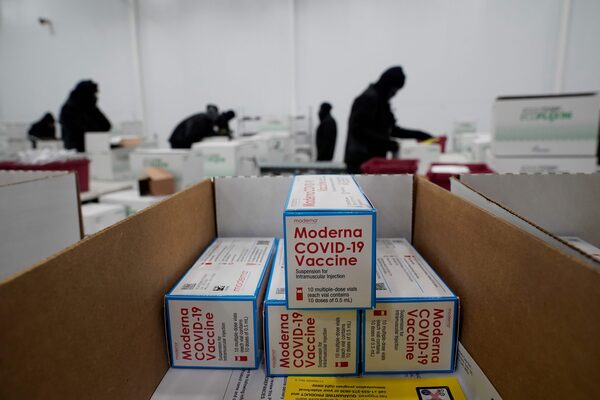 Boxes containing the Moderna COVID-19 vaccine are prepared for shipping at a McKesson distribution center in Olive Branch, Miss., on Dec. 20, 2020.PAUL SANCYA/AFP/Getty Images