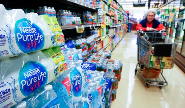 A woman pushes her shopping cart down the bottled-water aisle at a supermarket in Los Angeles on March 15, 2018.FREDERIC J. BROWN/AFP/Getty Images