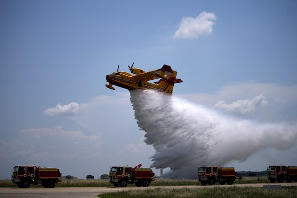 A Canadair water-bomber aircraft drops water during an exercise at the Nimes-Garons firefighters air base, near Nimes, southern France, on June 2.Daniel Cole/The Associated Press