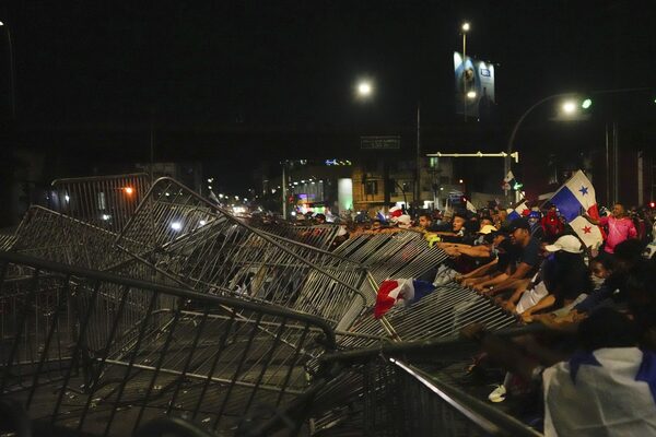 Demonstrators tear down a police barricade during a protest against a recently approved mining contract between the Panamanian government and Canadian mining company First Quantum, in Panama City, on Oct. 31.Arnulfo Franco/The Associated Press