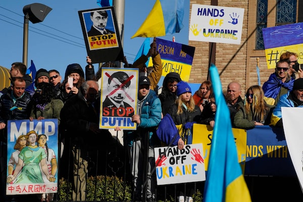 Demonstrators carry an effigy of Russian President Vladimir Putin during a protest against the Russian invasion of Ukraine in front of Saints Volodymyr and Olha Ukrainian Church in Chicago on Feb. 27, 2022.CHENEY ORR/AFP/Getty Images