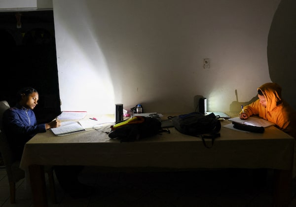 Mohammad Ameen Sha and Ismail Sha study with rechargeable lanterns for their final examination during one of the frequent power outages, called load-shedding, from South Africa's struggling power utility Eskom, because of ageing coal-fired power stations, in Cape Town, South Africa.ESA ALEXANDER/Reuters
