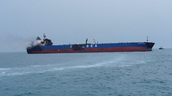 A foreign tanker carrying Iraqi fuel oil damaged after catching fire in Iraq's territorial waters, following unidentified attacks that targeted two foreign tankers, according to Iraqi port officials, near Basra, Iraq on March 12.Mohammed Aty/Reuters