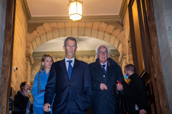 Lawyers Camille Haab, left, and Marc Bonnant, right, lawyer for Israeli businessman and diamond magnate Beny Steinmetz, at center, leaving the courthouse in Geneva, Switzerland, Jan. 22, 2021.Martial Trezzini/The Associated Press