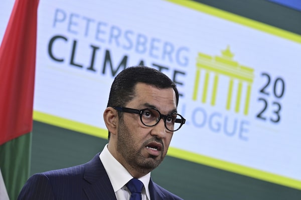 Sultan Ahmed al-Jaber, the minister of industry and advanced technology in the United Arab Emirates and COP28 UAE president-designate, attends a news conference in Berlin, on May 3.JOHN MACDOUGALL/The Associated Press