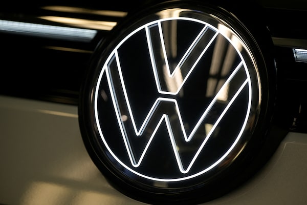 A Volkswagen logo is illuminated on a production line for the Golf VIII and Tiguan cars, at the VW headquarters, in Wolfsburg, Germany, on May 23.Fabian Bimmer/Reuters