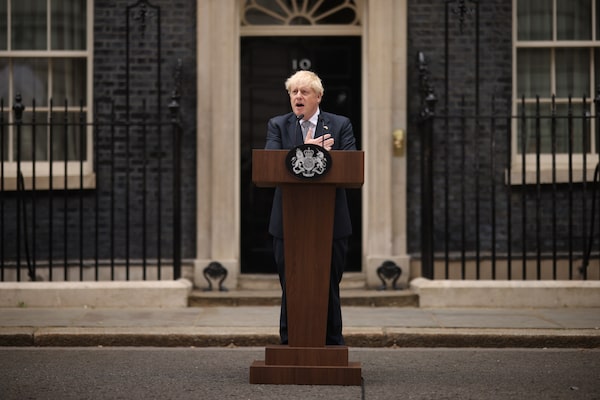 U.K. Prime Minister Boris Johnson addresses the nation as he announces his resignation outside 10 Downing Street, on July 7, 2022 in London, England.Dan Kitwood/Getty Images