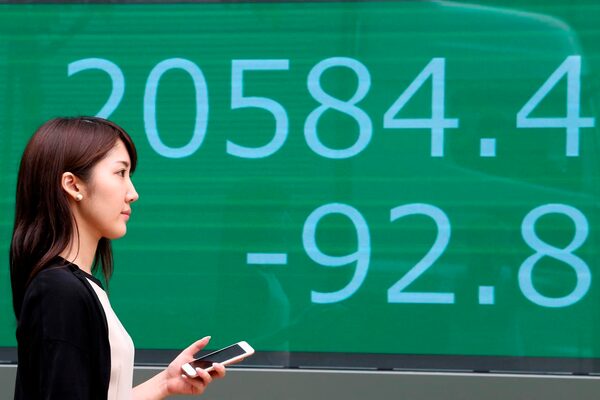 A woman walks by an electronic stock board of a securities firm in Tokyo.The Associated Press