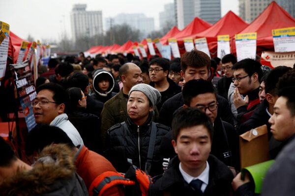 Job seekers attend an open air job fair for college graduates and the general public in Shijiazhuang, China, on Feb. 6, 2017.Thomas Peter/Reuters