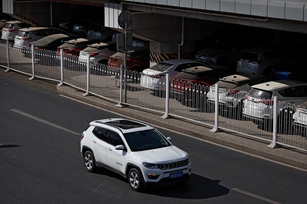 An SUV moves past Toyota cars stored underneath an overpass in Beijing on March 14, 2019.Andy Wong/The Associated Press