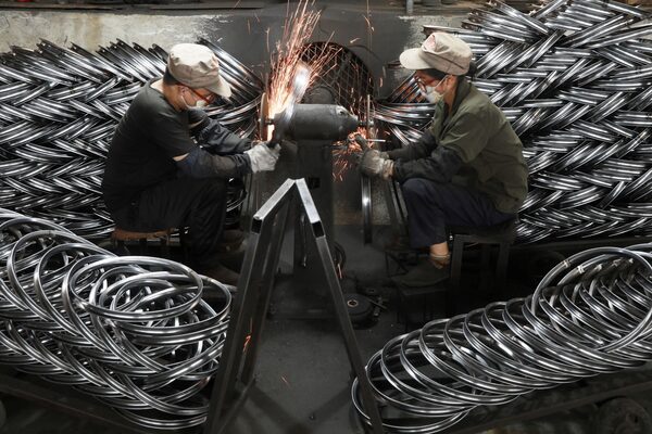 Workers polish bicycle wheels at a factory in Hangzhou, in China's eastern Zhejiang province, on July 15.-/Getty Images