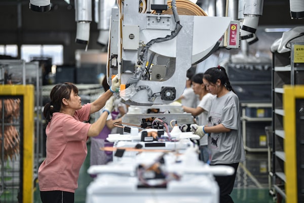 Employees work on a refrigerator assembly line at a factory for LG Electronics, in Taizhou, China, on May 23.STR/Getty Images