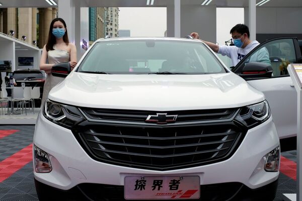 A model stands next to a Chevrolet vehicle at a sales event in Shanghai on May 5, 2020.SUN YILEI/Reuters