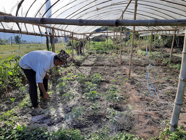 Dal Bahadur Rayamajhi works inside a plastic tunnel where his tomato crop is growing in Pyuthan, Nepal on Dec. 15, 2020.Thomson Reuters Foundation/Aadesh Subedi/Reuters