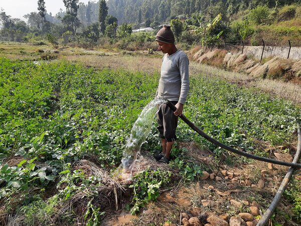 Mr. Rayamajhi now irrigates his land from a 75,000-litre tank constructed under the program, filled with water pumped from a borehole using a motor driven by hydroelectric power.